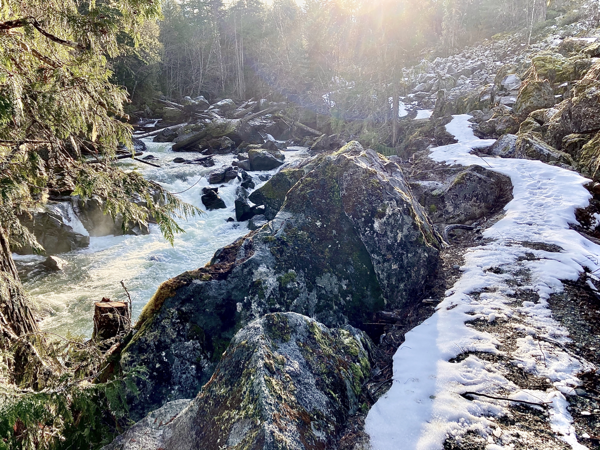 The trail section is located between Whistler and Pemberton and follows the Green River, passing through a prehistoric rock avalanche site known as the Rock Garden.